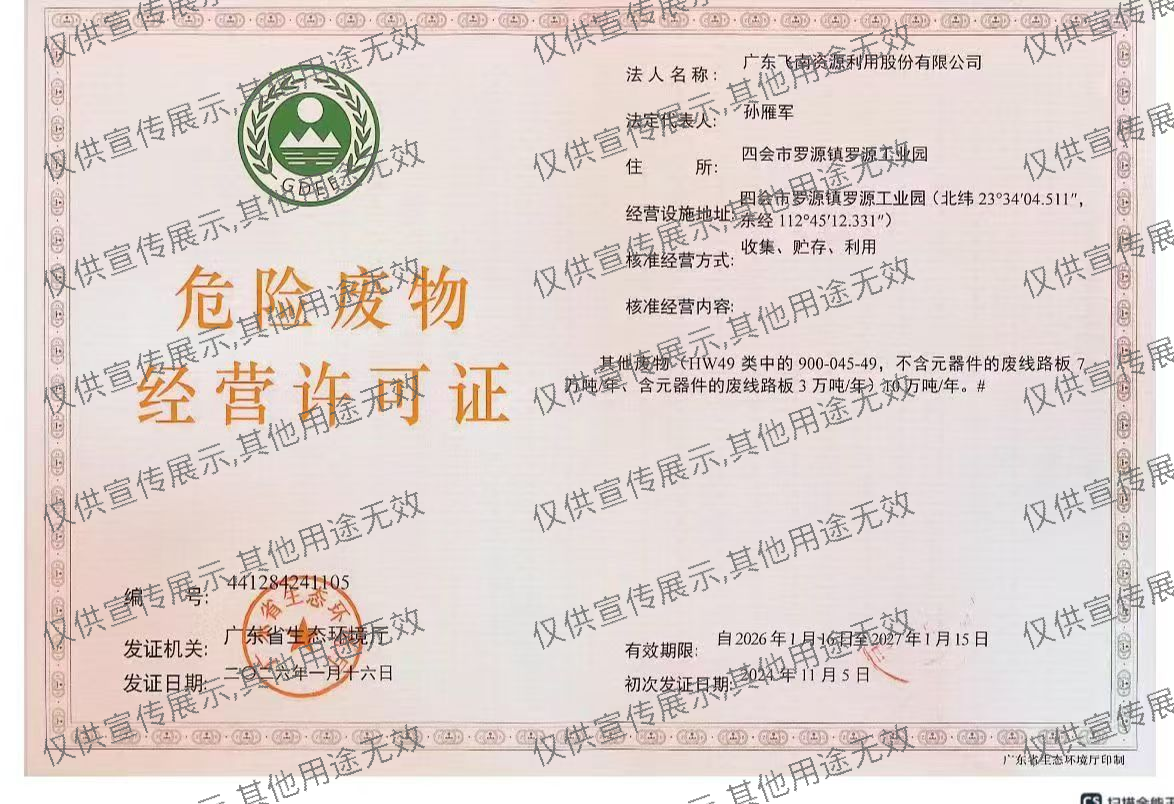 近日,广东飞南资源利用股份有限公司(股票代码:301500)顺利取得广东省生态环境厅颁发的《危险废物经营许可证》:10万吨/年废电路板处置资质。这一资质标志着飞南资源成为华南地区范围内拥有最大报废板处置能力的单体企业之一。