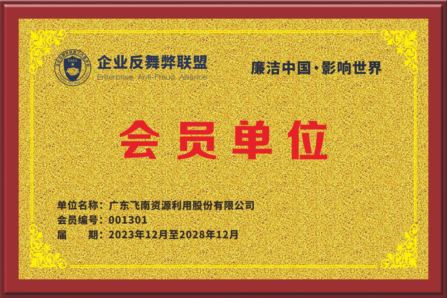 2024年8月,飞南资源正式申请并加入企业内部控制协会——企业反舞弊联盟,表明飞南资源坚持不断完善廉洁从业管理体系建设、提高企业反舞弊能力、营造廉洁的商业环境的决心,也进一步提升了公司廉洁文化建设水平,为公司廉洁合规建设增添新的反舞弊力量。