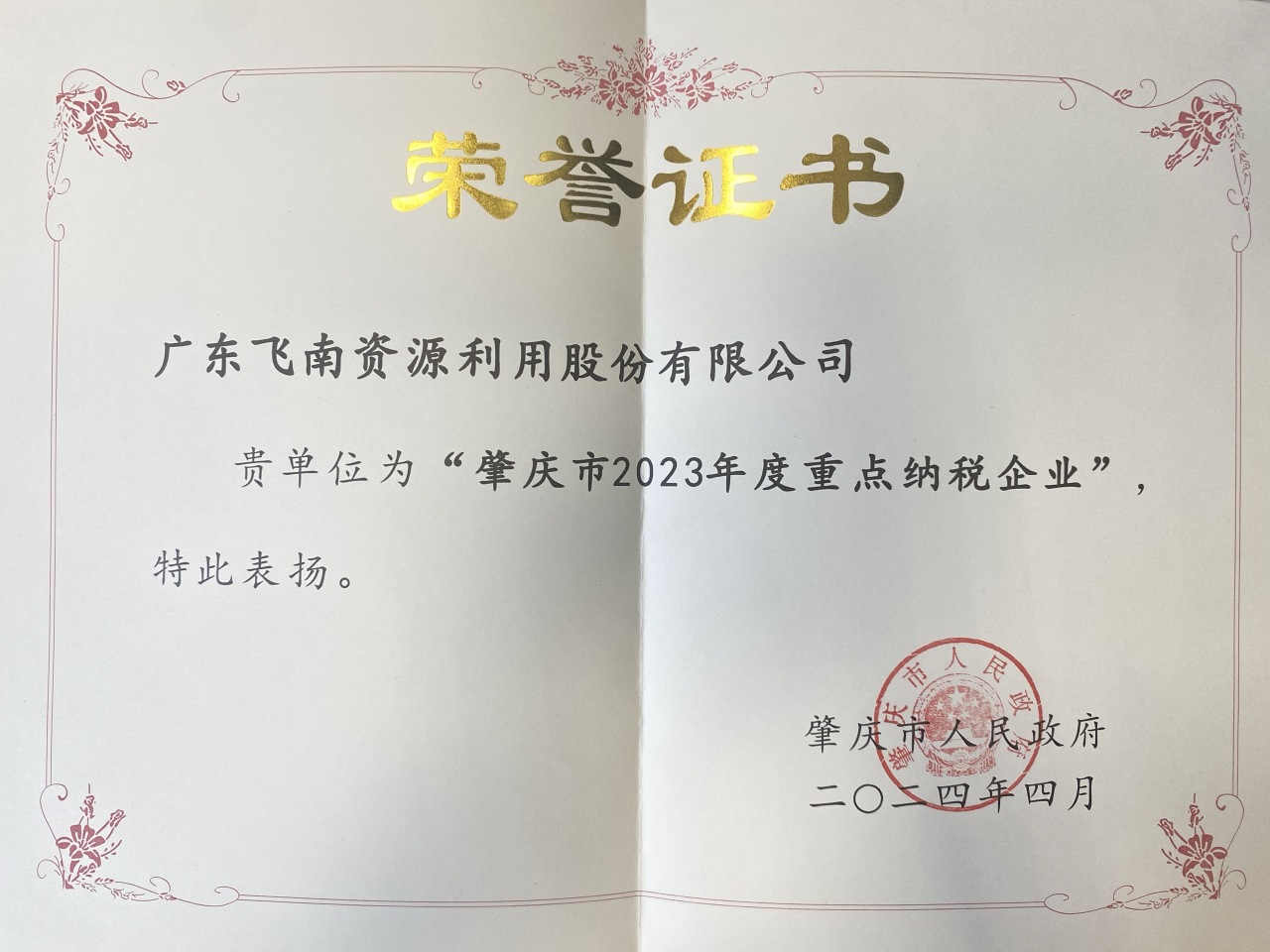 2024年4月,广东飞南荣获“肇庆市2023年度工业50强企业”、“肇庆市2023年度工业重点纳税企业”。