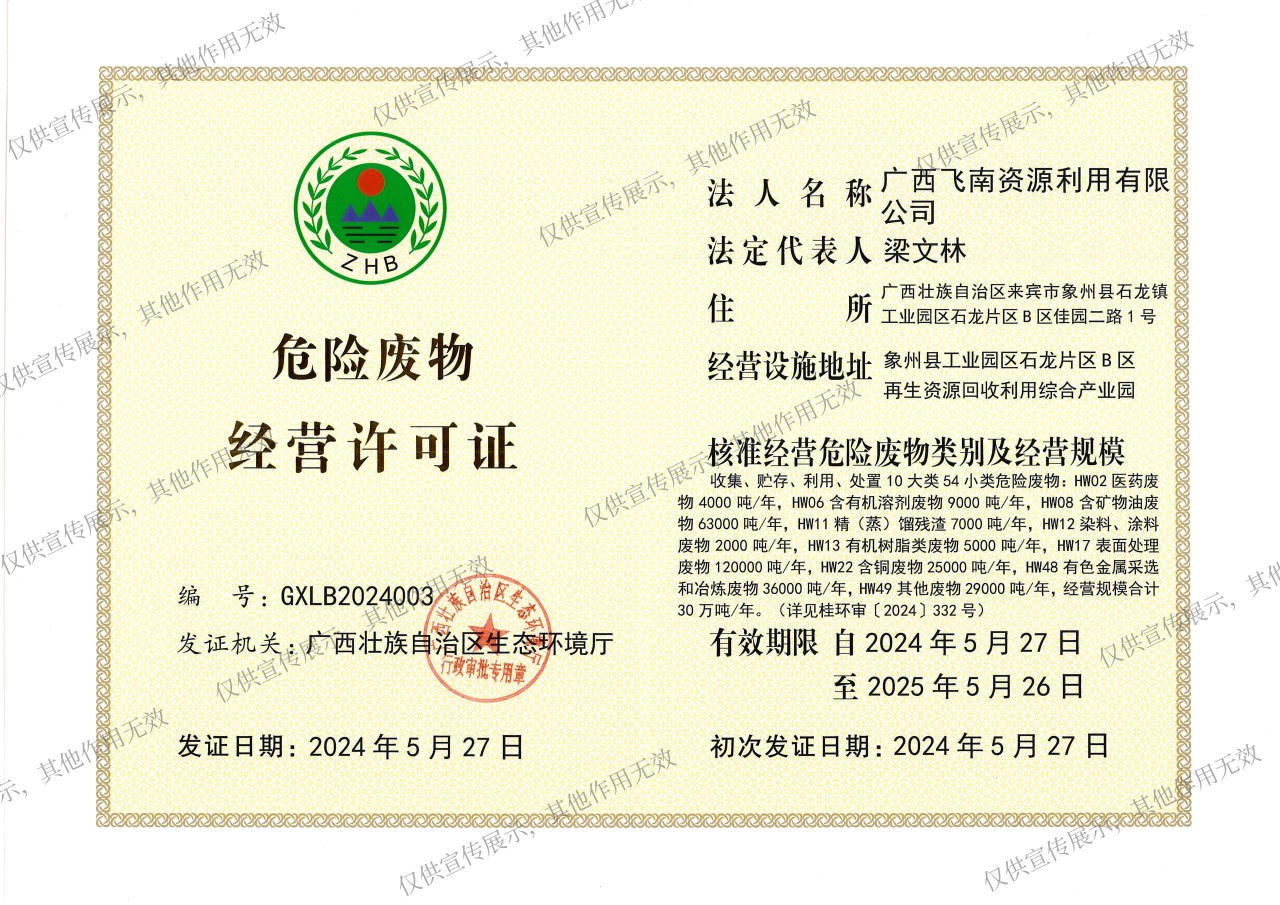2024年5月,广西飞南资源利用有限公司取得由广西壮族自治区生态环境厅颁发的《危险废物经营许可证》,核准经营规模30万吨/年。