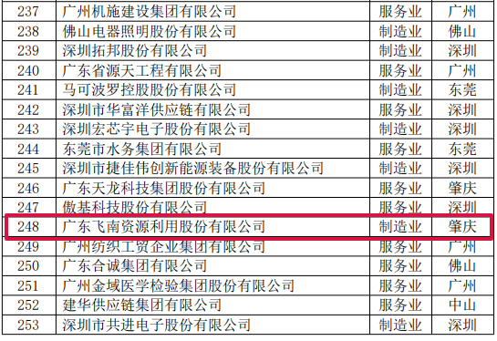 广东飞南资源利用股份有限公司凭借其卓越的经营业绩、创新的发展模式以及对社会经济的积极贡献,荣耀入选“广东企业500强”榜单,居2024广东企业500强第248位!这不仅是飞南发展历程中的又一座重要里程碑,更是对其综合实力与行业地位的高度认可!