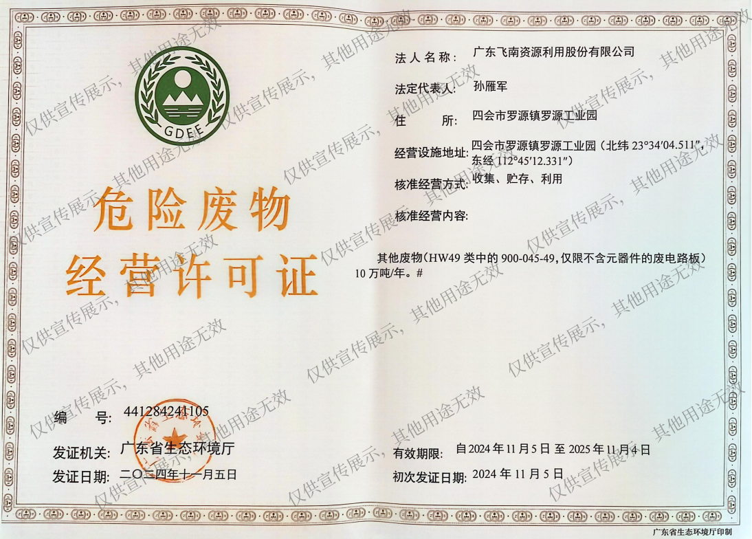 近日,广东飞南资源利用股份有限公司(股票代码:301500)顺利取得广东省生态环境厅颁发的《危险废物经营许可证》:10万吨/年废电路板处置资质。这一资质标志着飞南资源成为华南地区范围内拥有最大报废板处置能力的单体企业之一。