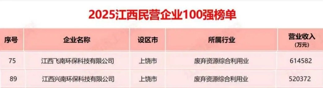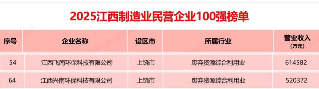 飞南资源(股票代码:301500)旗下两家全资子公司:江西兴南环保科技有限公司、江西飞南环保科技有限公司,凭借稳健的经营业绩和较强的综合实力,双双入选“江西民营企业100强”、“江西制造业民营企业100强”榜单!