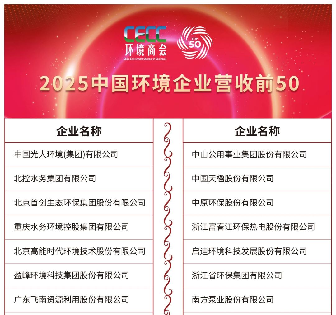 12月14日,由全联环境商会主办的“2025中国生态环境产业发展大会暨环境上市公司论坛”在北京盛大开幕,会上发布了“中国环境企业营收前50”榜单。