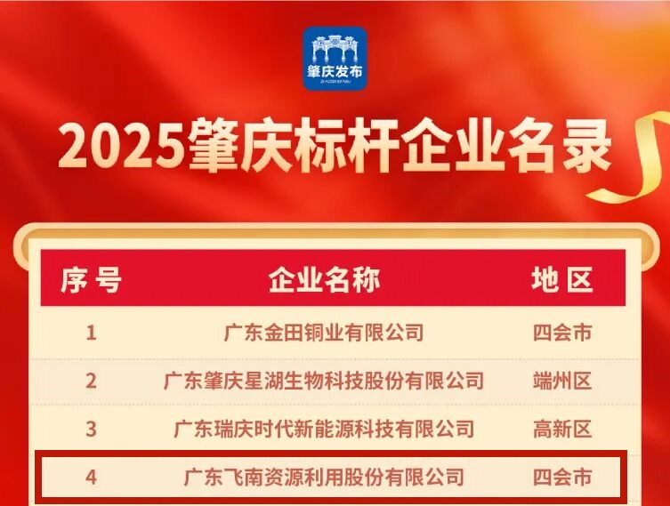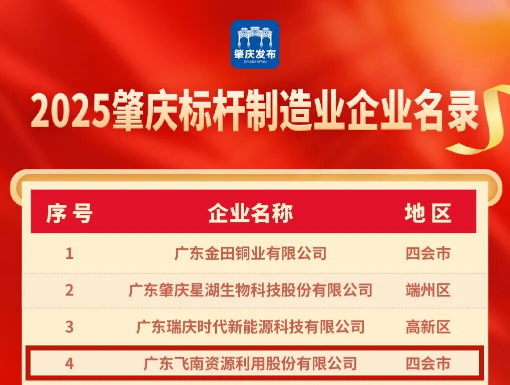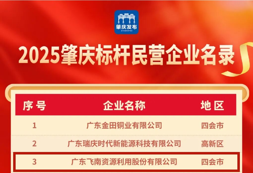 广东飞南资源利用股份有限公司凭借卓越的综合实力与行业贡献,一举斩获“2025肇庆标杆企业”、“2025肇庆标杆民营企业”、“2025肇庆标杆制造业企业”三大重量级称号,充分彰显了企业在区域经济发展中的领军地位与示范作用。